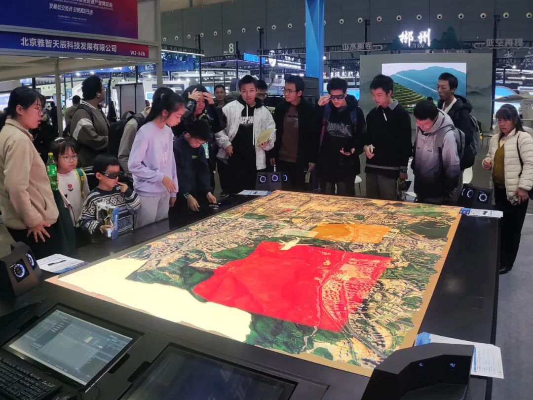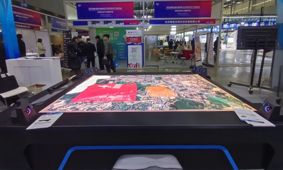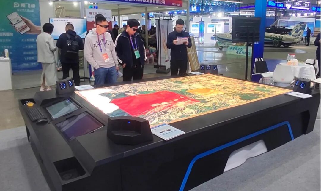 其中,三维全息交互沙盘桌成为展会的亮点之一,吸引了大量专业观众驻足体验。使用者可通过多模态交互手段操控虚拟场景,通过3D眼镜观看到三维立体全息影像,让体验者以“上帝视角”感受低空飞行模拟与空域管理的完整流程。