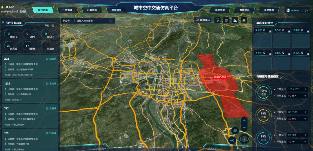 城市空中交通数字孪生仿真推演平台主要面向高校与科研院所的低空相关专业学科,通过整合飞行器、实景三维地理信息数据与空域规则等,构建 1:1 高精度数字孪生城市和低空空域数字镜像,为空域规划、飞行仿真与运行调度等教学科研任务提供支撑。
