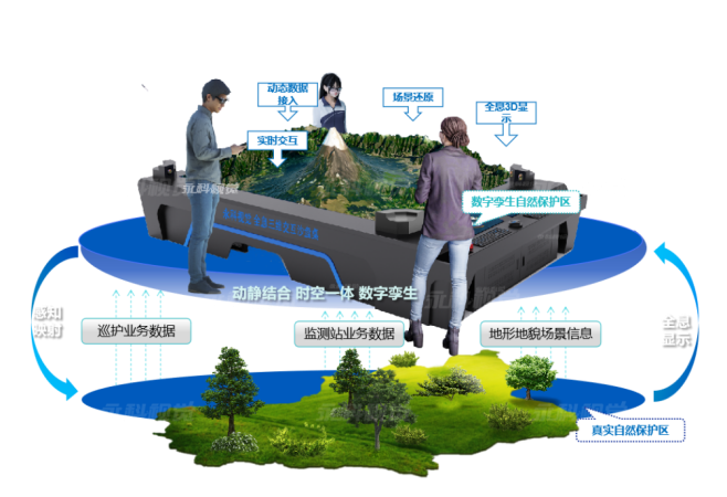 系统结合实景三维地理信息、数字孪生和三维全息交互技术,以三维全息交互沙盘桌为可视化终端,同时构建宁夏云雾山国家级自然保护区物理世界精准映射的虚拟数字孪生场景。通过统一时空基准,管理者可直观查看保护区地形地貌、资源分布及突发事件等核心要素的 “三维总览、直观可视”。本项目成功实施,显著提升管护效率与决策能力,更构建了数智技术赋能生态治理的实操样板,为保护区数智化转型树立了全新标杆。